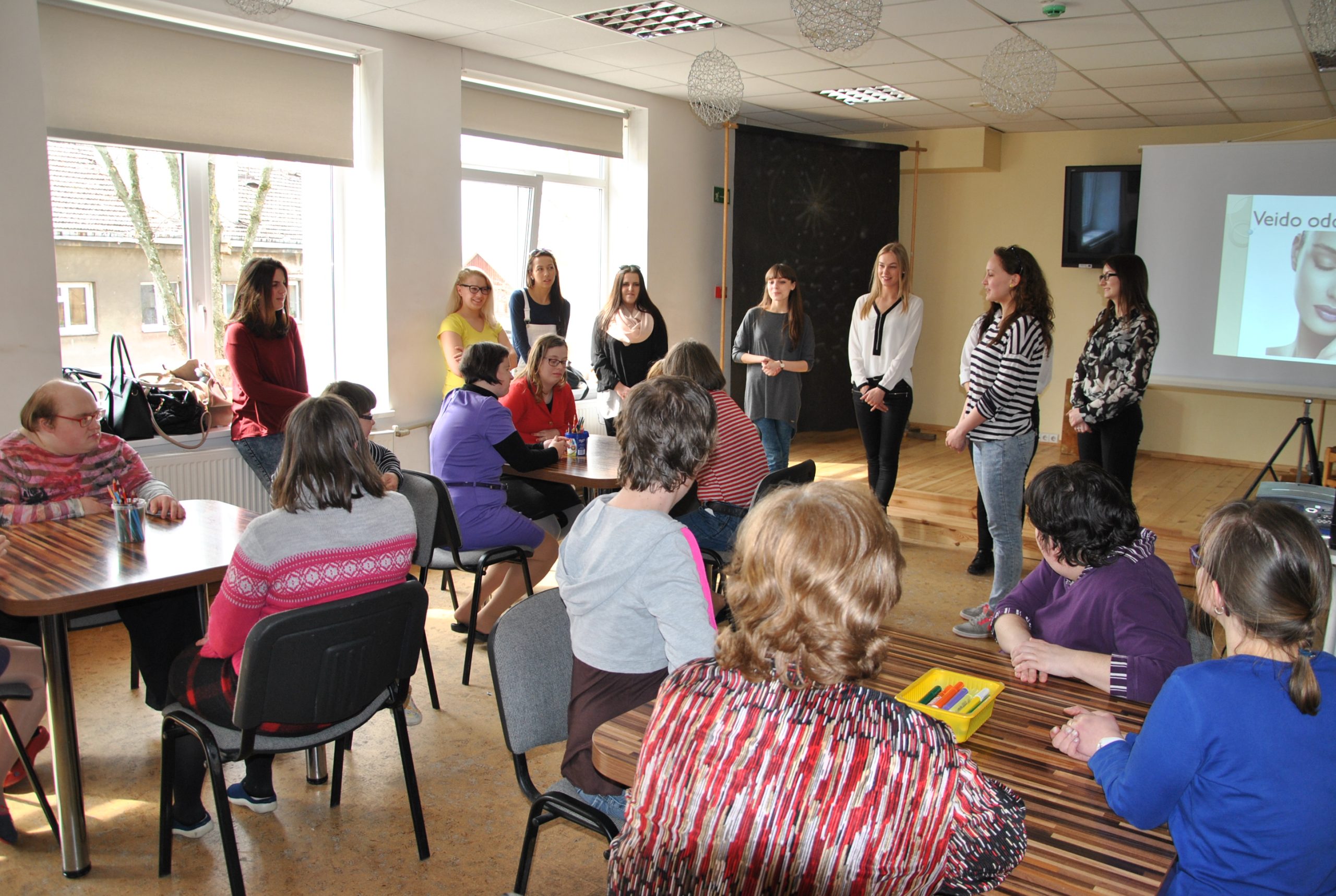 Vilniaus kolegijos Sveikatos priežiūros fakulteto studijų programos „Higieninė ir dekoratyvinė kosmetologija“ HK14 gr. studentės bei Grožio terapijos katedros lektorė Aurelija Kūgytė 2016 m. balandžio 8 d. buvo nuvykusios į dienos centrą „Šviesa“ pabendrauti su šio centro lankytojomis. Dienos centras yra socialinės globos įstaiga intelekto sutrikimų turintiems žmonėms nuo 16 m. amžiaus.