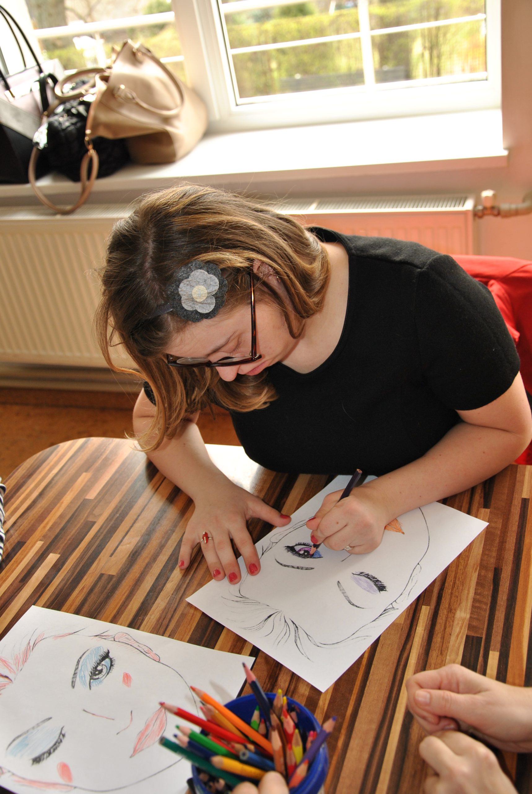 Studentės trumpai pristatė vakarinį ir dieninį makiažą bei jų skirtumus. Tada lankytojos „darė vakarinį makiažą“ – piešė ant popieriaus atspausdintų veidų. Ryškėjo drąsūs makiažai. Studentės drąsino šventės dalyves savo pagyrimais ir pasiūlymais: „Gal norėtum auskarus nupiešti?“, „Kaip manai, jei paryškintum skruostus?“ Viena iš dalyvių – Jūratė piešė atidžiai ir užtruko ilgiausiai.