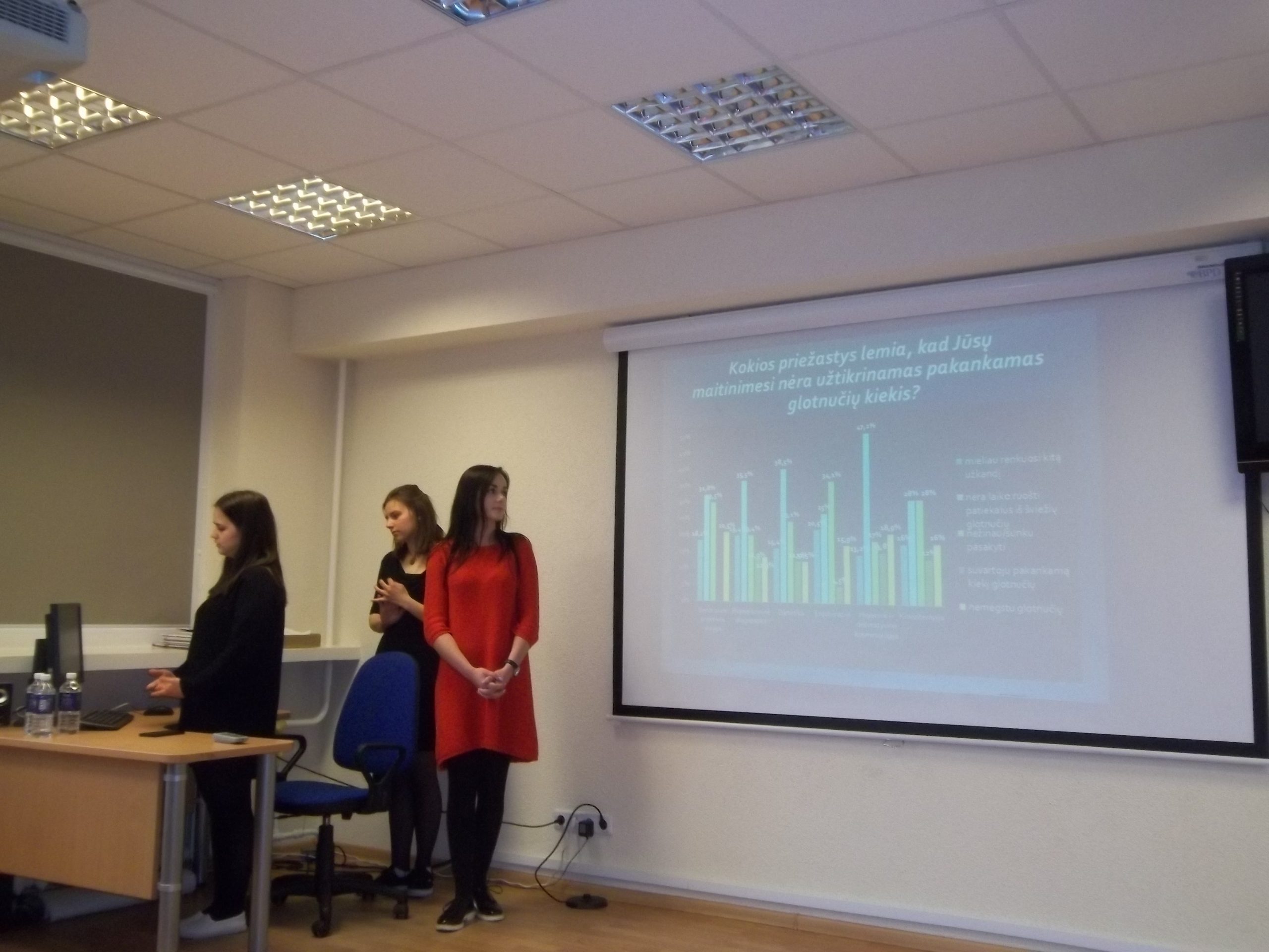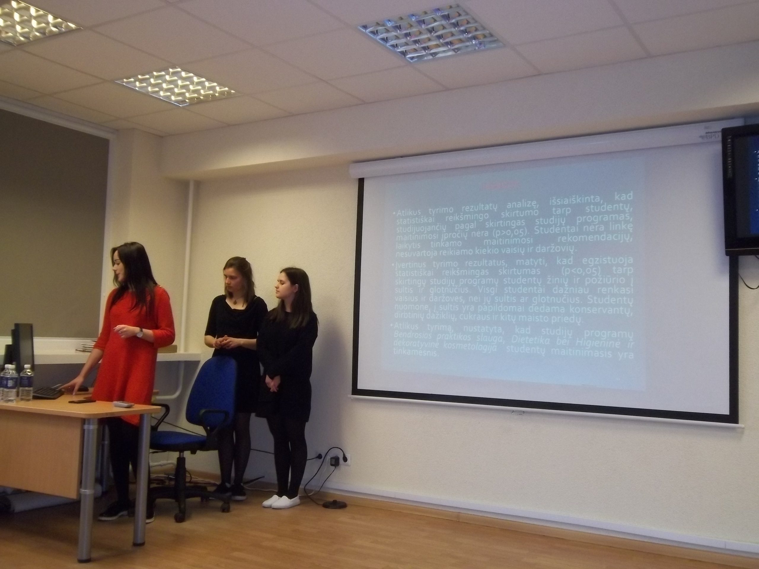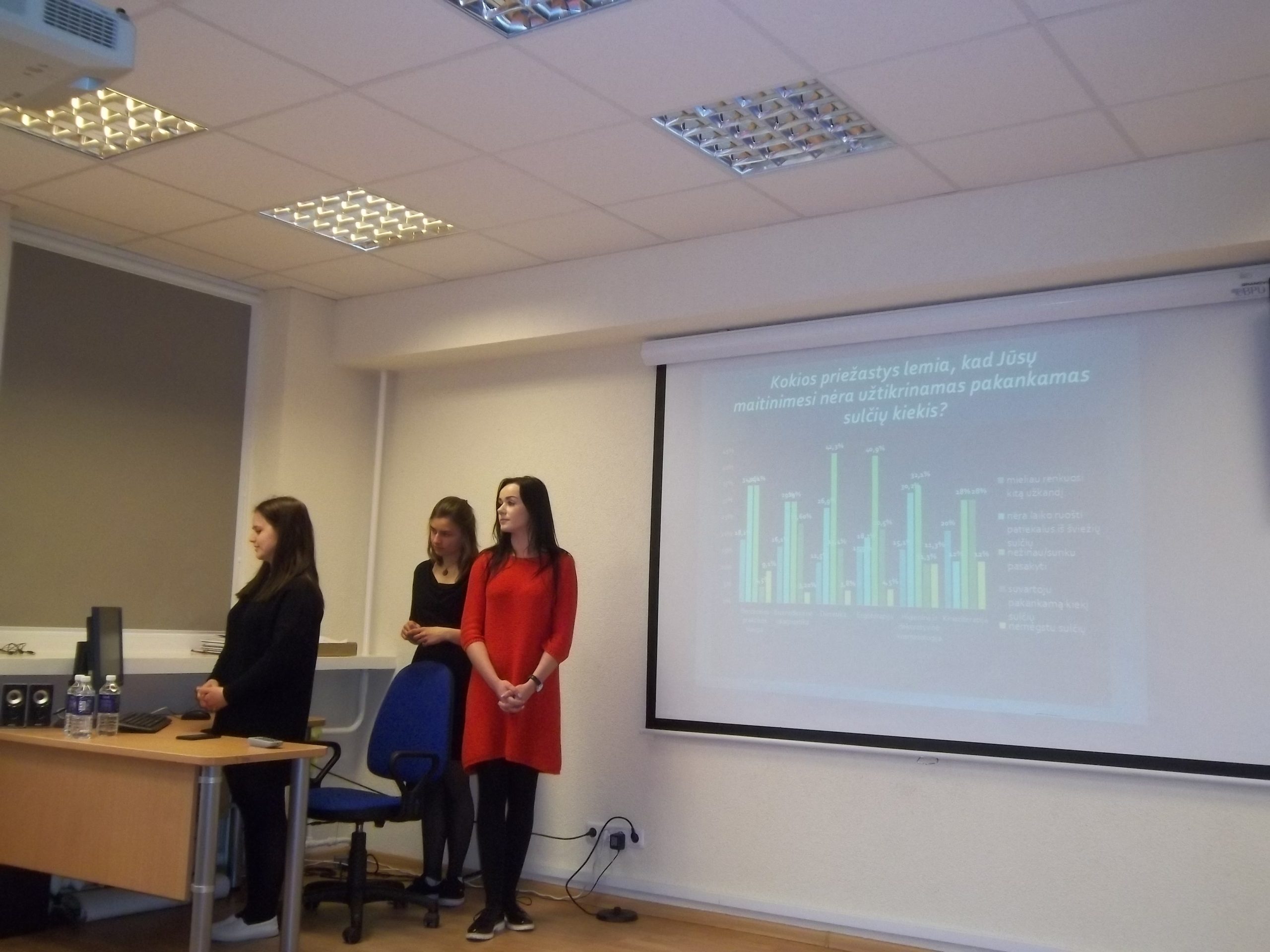 Pranešimą tema „Vilniaus kolegijos Sveikatos priežiūros fakulto studentų maitimosi įpročiai bei požiūris į sultis ir glotnučius“ skaitė studijų programos „Dietetika“ pirmo ir antro kurso studentės: Eglė Smalakytė, Reda Mickūnaitė ir Greta Žėkaitė. Studentus konferencijai parengė Sveikatos priežiūros fakulteto Biomedicininės diagnostikos ir dietetikos katedros dėstytojos Akvilė Sutkaitytė ir dr. Erika Kubilienė.