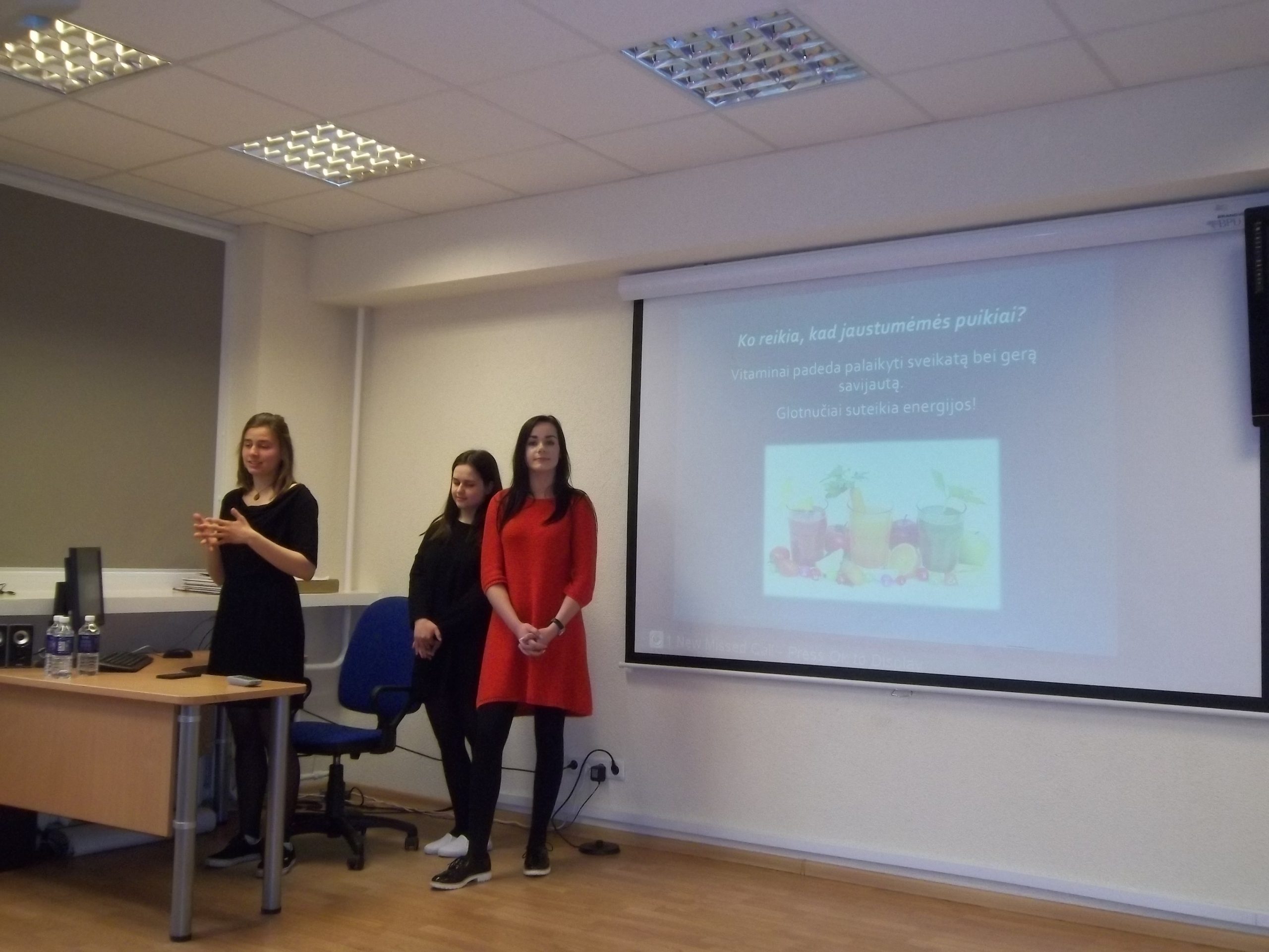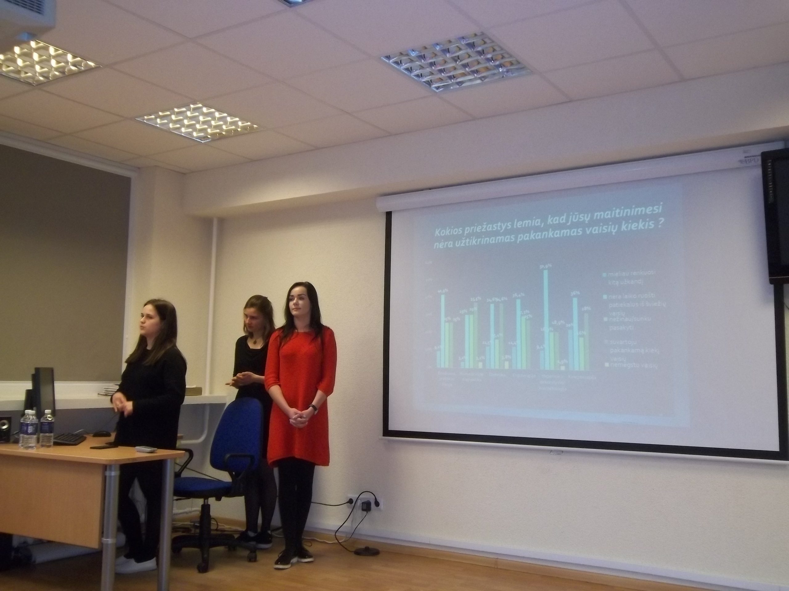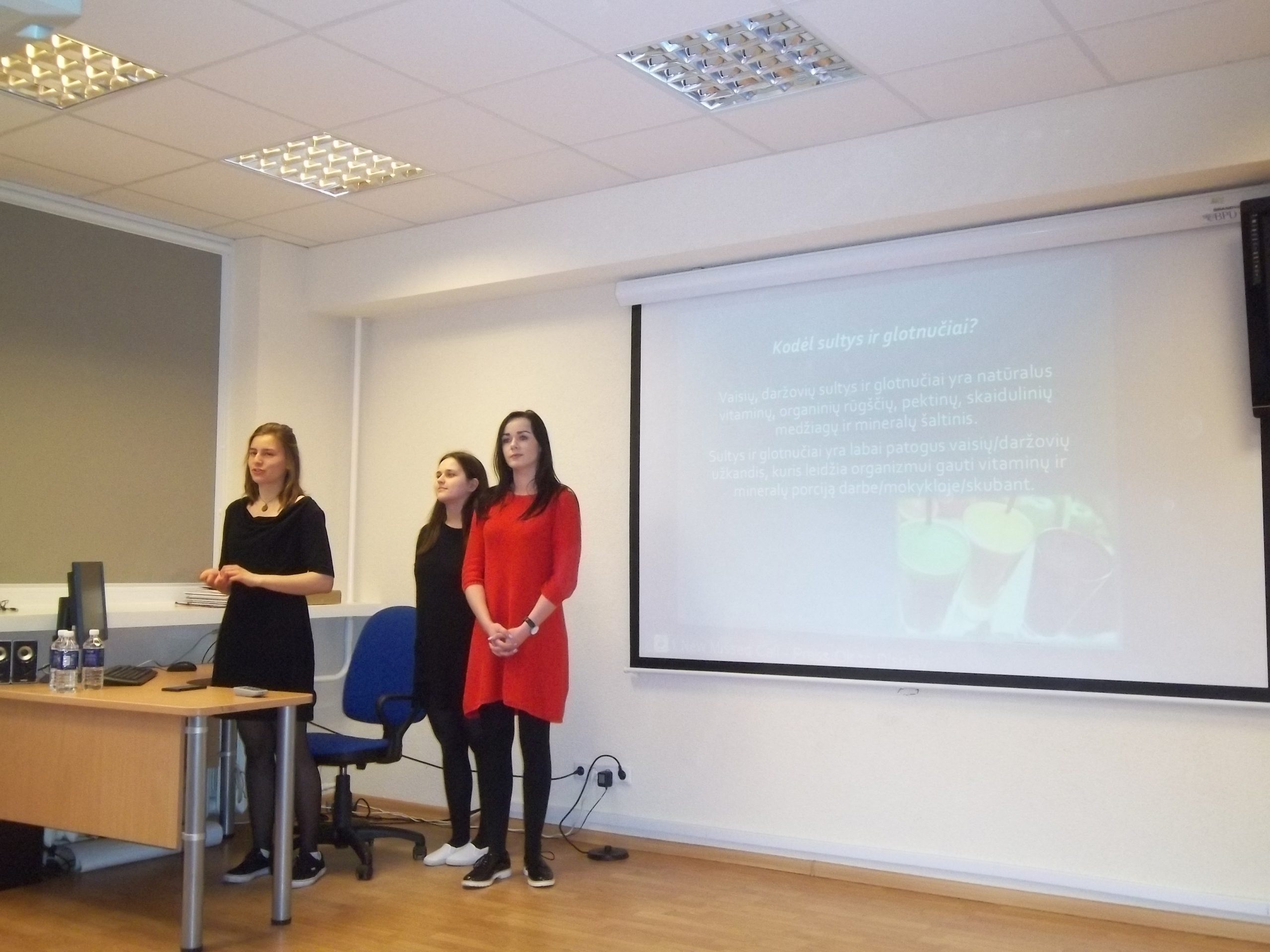 Pranešimą tema „Vilniaus kolegijos Sveikatos priežiūros fakulto studentų maitimosi įpročiai bei požiūris į sultis ir glotnučius“ skaitė studijų programos „Dietetika“ pirmo ir antro kurso studentės: Eglė Smalakytė, Reda Mickūnaitė ir Greta Žėkaitė. Studentus konferencijai parengė Sveikatos priežiūros fakulteto Biomedicininės diagnostikos ir dietetikos katedros dėstytojos Akvilė Sutkaitytė ir dr. Erika Kubilienė.