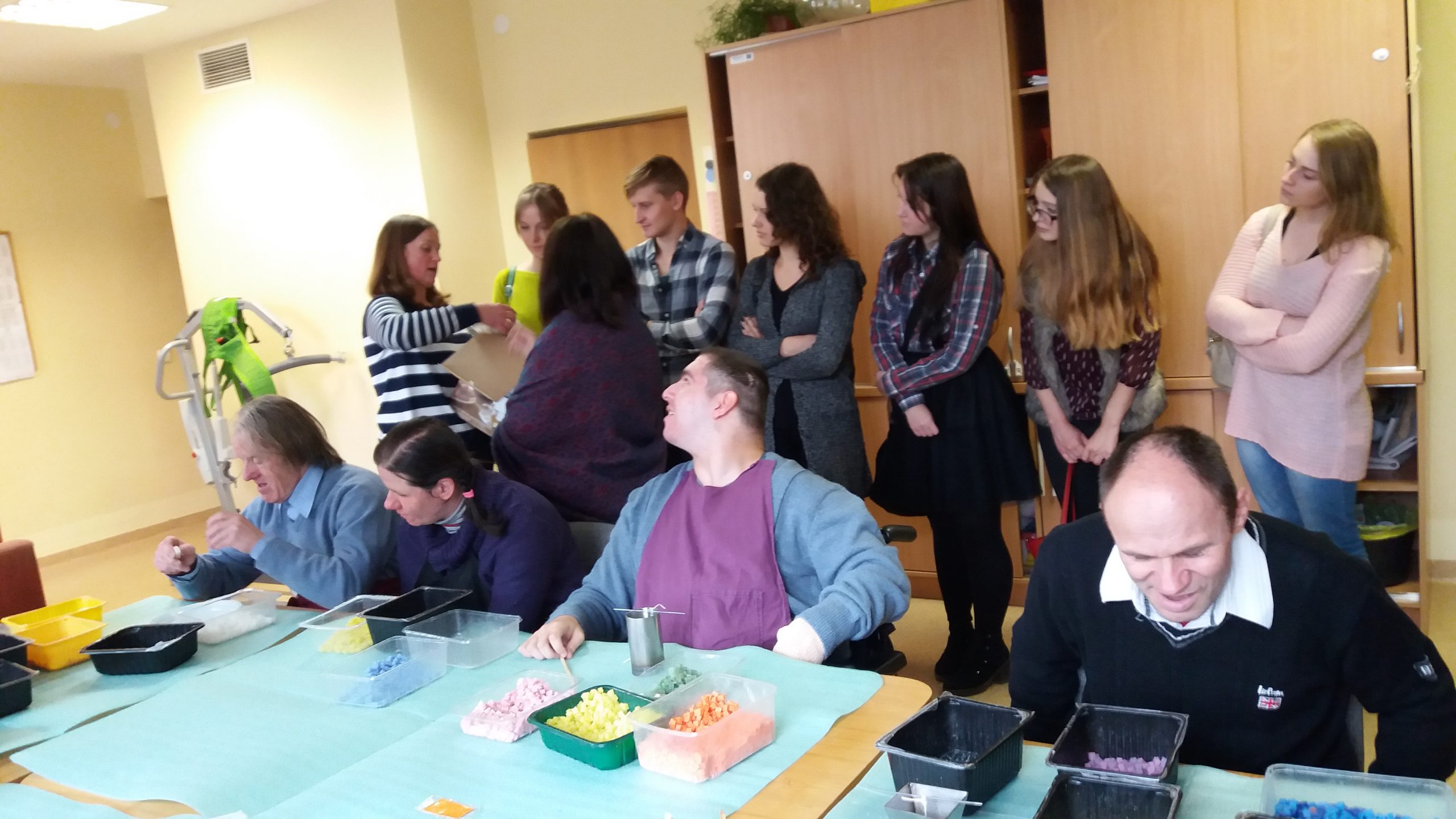 Rugsėjo 19 d. Grožio terapijos katedros lektorė Aurelija Kūgytė ir studijų programos „Ergoterapija“ ER 15 gr. studentai buvo nuvykę į dienos centrą „Šviesa“. Dienos centras yra dienos socialinės globos įstaiga žmonėms nuo 18 m., turintiems intelekto sutrikimų. Centre lektorę ir studentus lydėjo ir su centro lankytojais supažindino direktoriaus pavaduotoja Sigita Narauskaitė. Lankytojai į dienos centrą „Šviesa“ atvyksta kaip į darbą. Pirmoje dienos pusėje jie turi galimybę rinktis staliaus, sporto, mezgimo, žvakių gamybos, maisto ruošimo, tekstilės, socialinių įgūdžių ar suvenyrų dirbtuvę. Po pietų centro lankytojai savo gebėjimus gali lavinti teatro, muzikos, dailės ar keramikos studijose. Pasak Sigitos Narauskaitės, žmogus dienos centre gali kurti, atskleisti savo gebėjimus ir užmegzti bei vystyti santykius su kitu žmogumi.