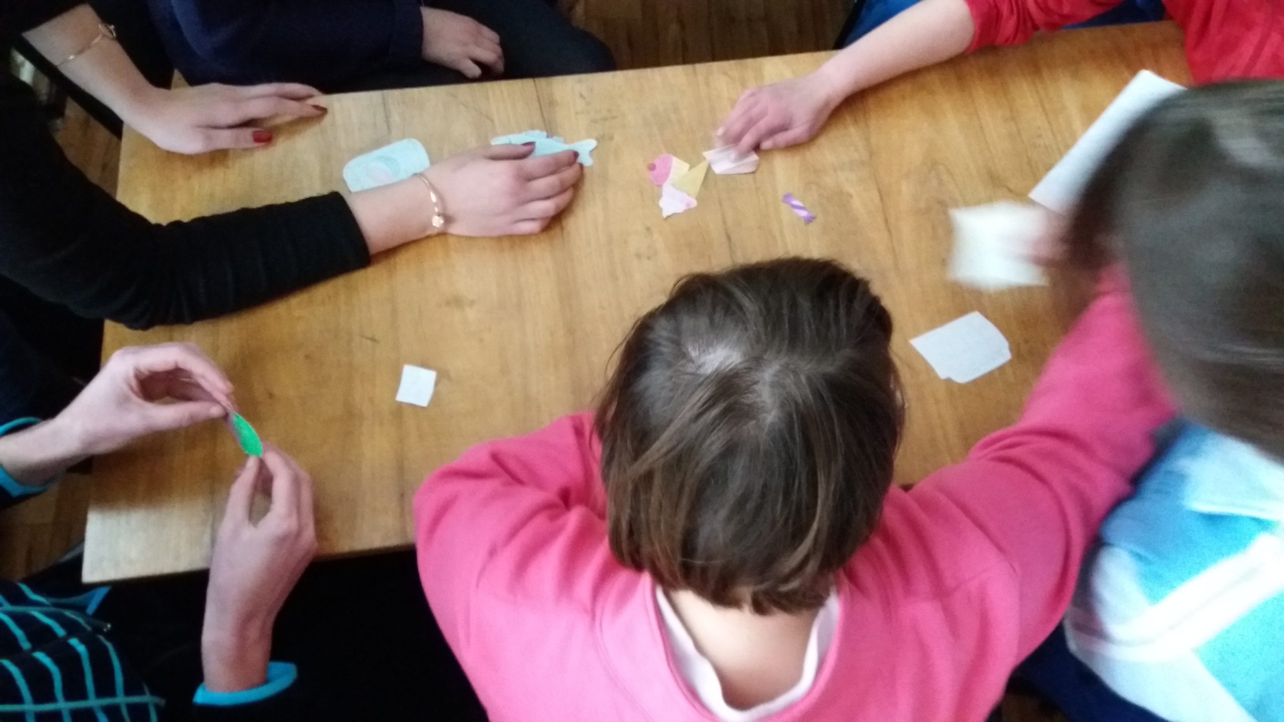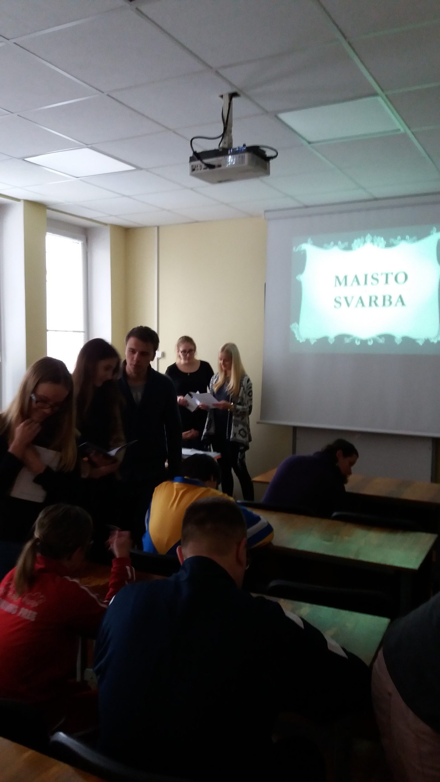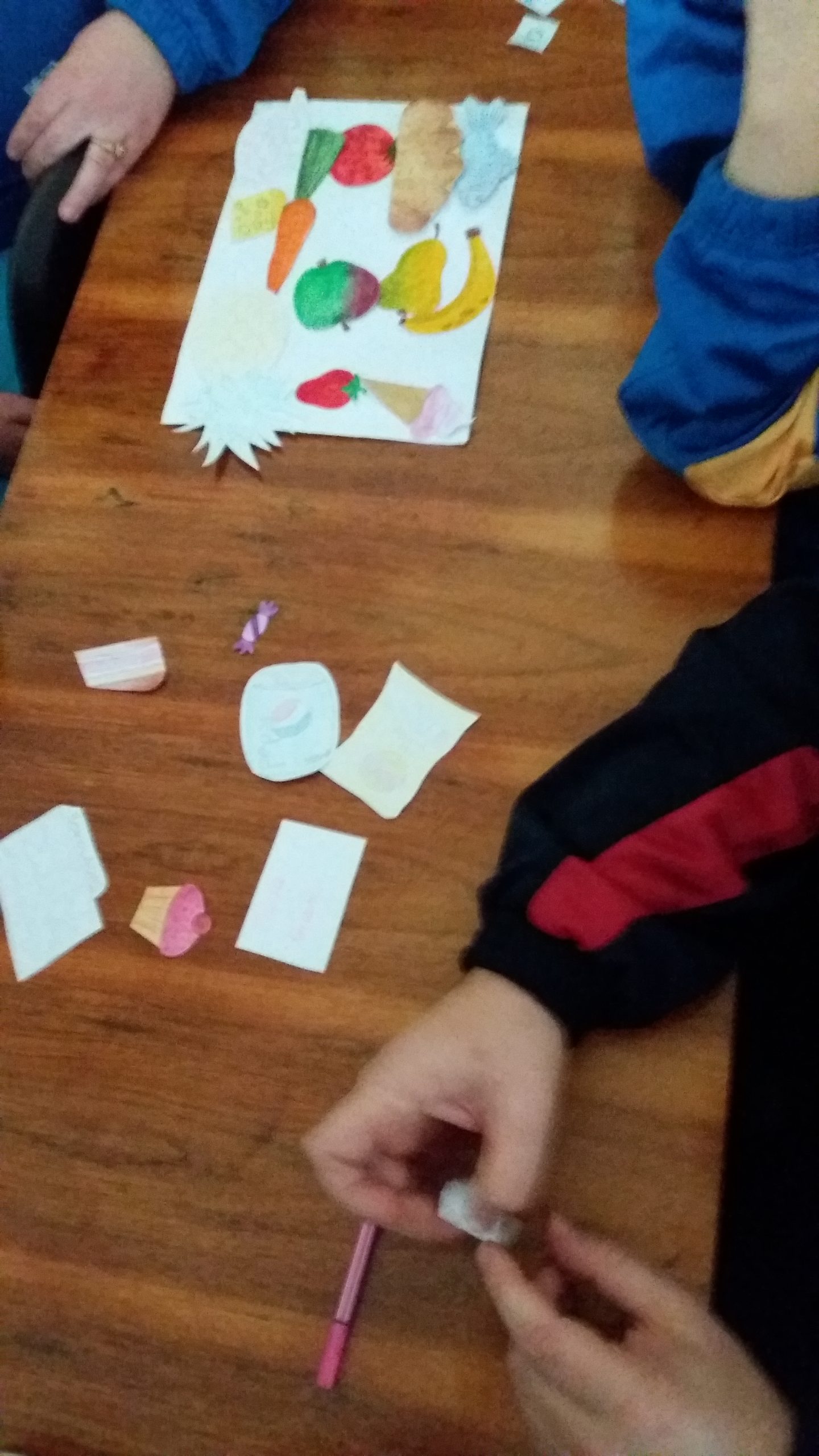 Studentai pasiūlė žaidimą „Sveiki maisto produktai“. Svečiai rinkosi iš popierinių maisto produktų į popierinį krepšelį sveikus produktus. Krepšelyje atsidūrė ananasai, vynuogės, braškės, morkos, žuvis ir ledai. Visi kartu susitarė, kad kartais valgyti saldumynus galima. Centro lankytojai iš SPF išvažiavo linksmi ir pilni įspūdžių. „Viskas patiko“ – beveik visi susitikimo dalyviai apibendrino savo reakcijas.