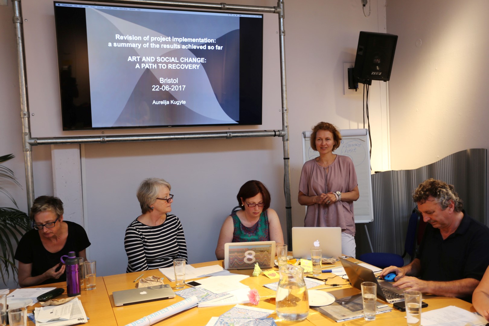 2017 m. birželio 21–23 dienomis Vilniaus kolegijos Sveikatos priežiūros fakulteto Slaugos katedros Slaugos katedros Viktorija Kielaitė ir Grožio terapijos katedros Aurelija Kūgytė kartu su Vilniaus kolegijos Menų ir kūrybinių technologijų fakulteto Projektų skyriaus vedėja, Kultūrinės veiklos vadybos katedros lektore Raimonda Agne Medeišiene Bristolyje (Jungtinė Karalystė) dalyvavo organizacijos „Arts and Health South West“ (Jungtinė Karalystė) organizuojamame tarptautiniame Erasmus+ programos strateginės partnerystės KA2 projekto „Menas ir socialinis virsmas“ („ART and SOCIAL CHANGE: a path to recovery“, sutarties Nr. 2016‐1‐LT01‐KA202‐023234) partnerių susitikime. Projekto tikslas – sukurti tarpdisciplininę mokymo programą, sudaryti galimybę pasidalinti savo patirtimi artistams, sveikatos priežiūros specialistams ir žmonėms, sveikstantiems nuo priklausomybių. Susitikime dalyvavo atstovai iš visų projekto partnerių organizacijų: Portraits of Recovery (Jungtinė Karalystė), Comunit Terapeutica Casa die Giovani (Italija), Institut für Projektbegleitung und Kompetenzentwiklung (Vokietija), La Maison de L´Image (Prancūzija), VšĮ „Socialiniai paramos projektai“ (Lietuva), Vilniaus kolegija.