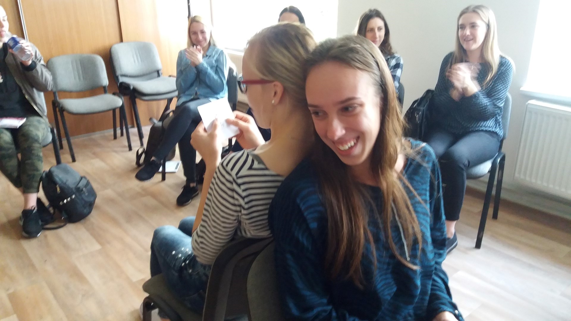 „Staiga aplankė stipri baimė, tačiau ją iškart nugalėjo didžiulis noras, iššūkis sau, kaip seksis bendrauti su proto negalią turinčiais asmenimis? Šiandien, rugsėjo 25 d., kartu su psichologijos dėstytoja Aurelija Kūgyte vykome į dienos centrą „Šviesa“. Mus, dešimt „Ergoterapijos“ studijų programą studijuojančių merginų (ER16 gr.), pasitiko dienos centro „Šviesa“ direktoriaus pavaduotoja Sigita Narauskaitė ir ratu jaukiai susodino posėdžių salėje. Sigita išsamiai papasakojo dienos centro „Šviesa“ istoriją, paaiškino, kad centrą lanko aštuoniasdešimt šeši pacientai, turintys tiek sunkią, tiek vidutinę proto negalią. Proto negalią turintys lankytojai atvežami autobusais 7.00 val. ryto, o nuo 16.30 val. išvežami į namus. Šiame centre suteikiamos darbinio, laisvalaikio, socialinio bei kultūrinio užimtumo paslaugos. Tačiau didžiausias dėmesys skiriamas kūrybiškumui. Tikima, jog taip neįgalus žmogus išlies savo pyktį, agresyvų elgesį ir leis pasireikšti vidiniam pasauliui, asmenybei. Sigitai pasakojant apie užsiėmimus proto negalią turintiems žmonėms į posėdžių salę atskubėjo besišypsanti Miglė, kuri čia lankosi jau šeštus metus. Ji drąsiai pareiškė, kas sukosi jos galvoje, labai norėjo mus visas pakalbinti ir buvo kupina energijos. Miglė dalinosi su mumis, jog labai svarbu palaikyti tarpusavyje gerą nuotaiką, svarbu suprasti, padėti vienas kitam. Toks Miglės požiūris labai sužavėjo, ji iškart privertė mus visas nusišypsoti ir sukūrė jaukią atmosferą. Vėliau į mūsų ratelį prisijungė dar keli žmonės, turintys proto negalią. Jie dalinosi įspūdžiais iš kelionių, renginių, „Bočių“ varžybų. Pasakojo, jog moka vaidinti, mušti būgnais, gamina keramikos dirbinius, sportuoja, groja orkestre, dalinosi savo svajonėmis. Labiausiai džiugino, jog stebint, kaip jie visa tai pasakoja, jų akys blizgėjo, o nuo veido nedingo šypsena, optimizmas liejosi per kraštus! Juk daugelis žmonių vaikšto paniurę vien dėl blogo oro… Žiūrint į juos, klausant jų tiesiog netveria iš laimės kupina širdis… Viena populiariausių veiklų, kuriomis jie užsiima dienos centre „Šviesa“ – žvakių gamyba. Jie dažo žvakes, jas užpila parafinu ir pagamintas pardavinėja mugėse. Tai tik įrodo, kokie jie yra lygiaverčiai su mūsų visuomene ir puikiai įsitraukia į visuomeninę veiklą, taip skatindami bendruomeniškumą. Iš šių žmonių su negalia mes galime tik pasimokyti džiaugsmo gyventi, pozityvumo, pagalbos ir supratimo vienas kitam, nepaisant neįprasto jų atvirumo. Jie yra savimi! Tad būkime ir mes tokiais, priimkime vieni kitus, kokie esame, būkime drąsūs. Jie to mus moko, imkime pavyzdį!“