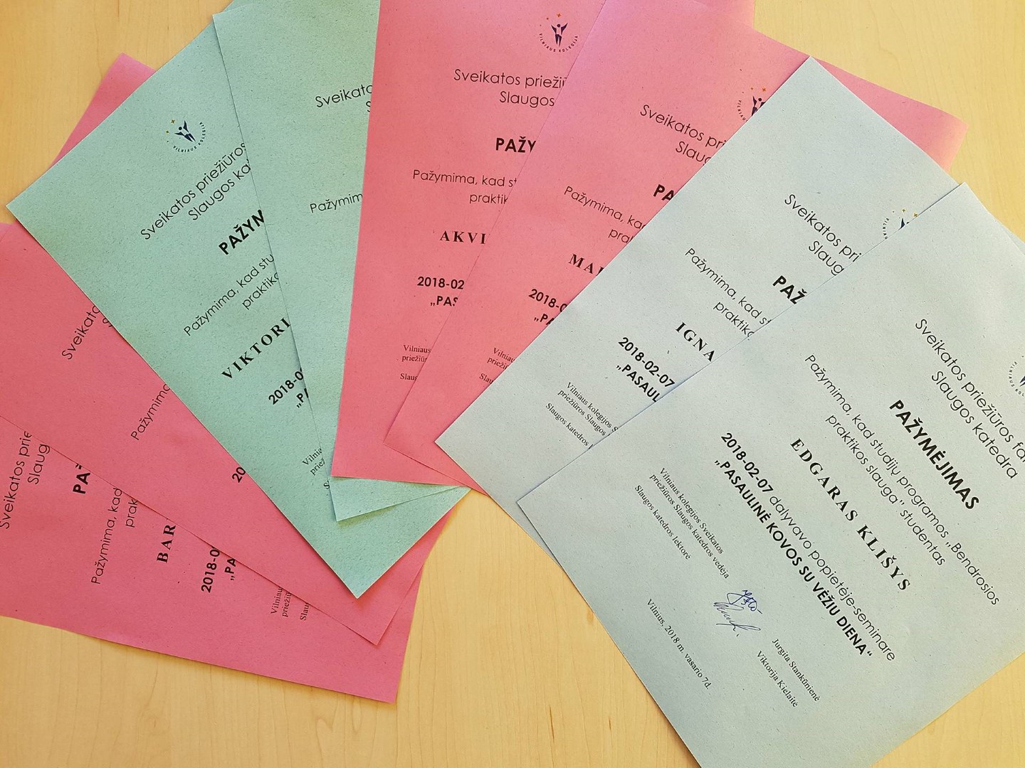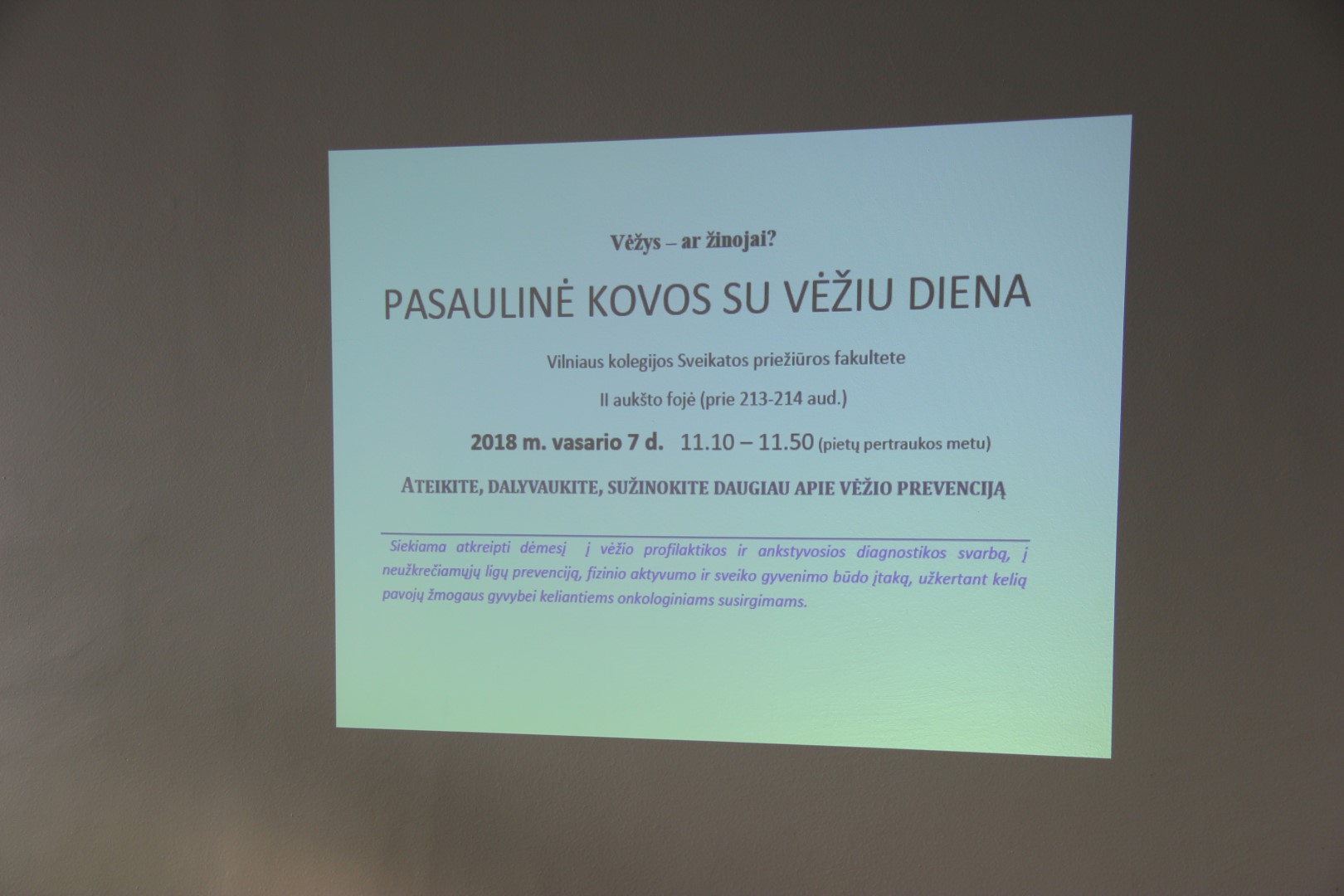 2018 m. vasario 7 d. Sveikatos priežiūros fakultete vyko popietė-minėjimas „Pasaulinė kovos su vėžiu diena“. Į renginį, kurio tikslas – atkreipti dėmesį į vėžio profilaktikos, sveiko gyvenimo būdo įtaką onkologiniams susirgimams ir ankstyvosios diagnostikos svarbą, susirinko studentai ir Slaugos katedros dėstytojai. Žodinį pranešimą „Mamų žinios apie gimdos kaklelio vėžį ir jo profilaktiką pristatė SL16D gr. studentės Viktorija Košytė ir Barbora Kisieliūtė“ (vadovės docentė dr. Zyta Kuzborska ir lektorė Agnė Jakavonytė-Akstinienė). SL15A gr. studentė Viktorija Lamanauskaitė pristatė tyrimo „Jaunų žmonių ypatumai: rūkymo atvejis“ rezultatus (vadovė lektorė Viktorija Kielaitė). Slaugos katedros lektorė Viktorija Kielaitė pristatė SL14 gr. absolventės Lauros Pociūtės darbą „Jaunų moterų žinios apie krūties vėžį ir jo profilaktiką. Socialinė iniciatyva“. SL16E gr. studentės Akvilė Sungailaitė ir Marta Skiutaitė parengė stendinį pranešimą „Onkologiniai susirgimai“ (vadovė docentė dr. Zyta Kuzborska). Popietę-minėjimą Pasaulinė kovos su vėžiu diena“ vedė ir parodą „Ką apie vėžį kalba internetas“ surengė SL15D gr. studentai Edgaras Klišys ir Ignas Kaziukonis. Studentams, pristačiusiems savo darbus, Slaugos katedros vedėja Jurgita Stankūnienė įteikė dalyvavimo pažymėjimus.