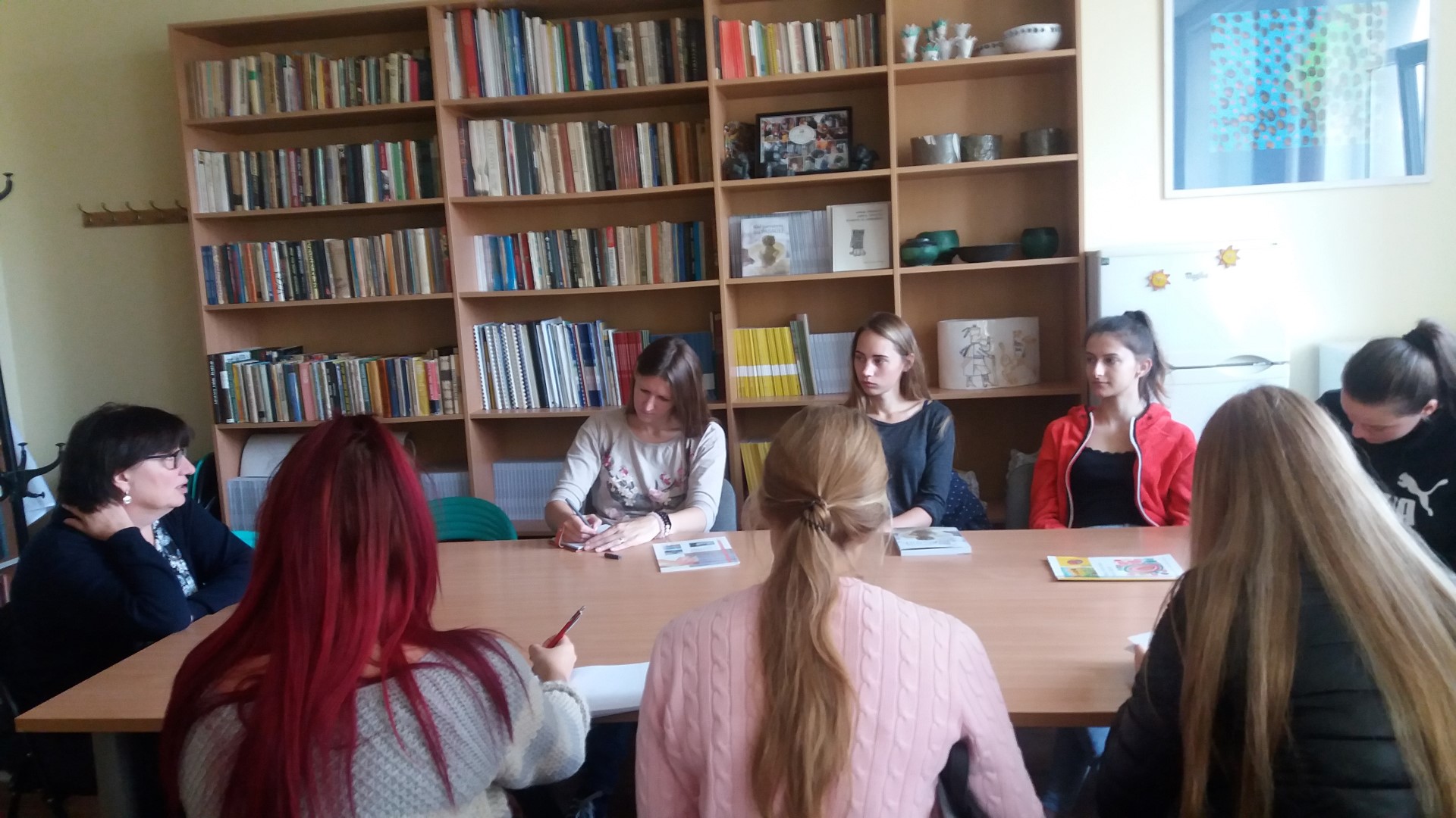 Vėliau prisijungė ir keli centro lankytojai: Ernesta, Miglė ir Povilas. Jie mums pasakojo, ką labiausiai mėgsta veikti, dalinosi mintimis ir šiluma. Sužinojome, kad keli iš jų dirbs padavėjais naujai atsidariusioje kavinėje „Pirmas blynas“. Darbuotojos pasakojo, kad prieš savaitę Ernesta ir Povilas dalyvavo apmokymuose. Buvo nelengva, tačiau jie su džiaugsmu mokėsi ir nekantrauja kibti į darbus.