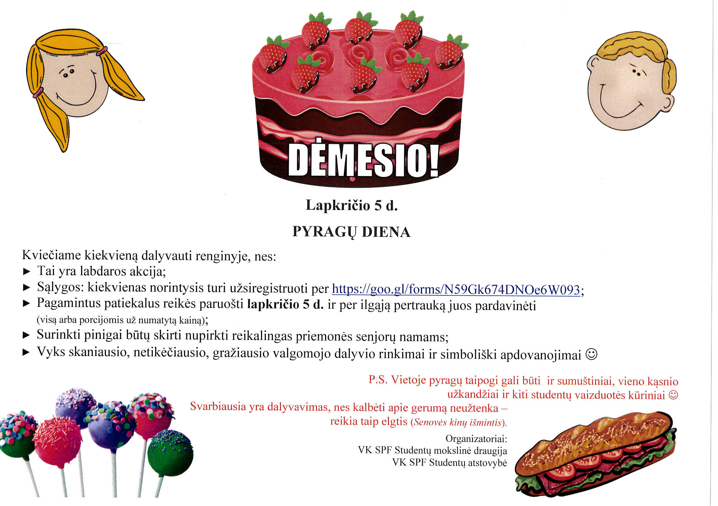 Vilniaus kolegijos Sveikatos priežiūros fakulteto studentų mokslinė draugija ir Sveikatos priežiūros fakulteto studentų atstovybė visus kviečia dalyvauti labdaros renginyje „Pyragų diena“, kuris vyks fakultete lapkričio 5 d. per ilgąją pertrauką.
