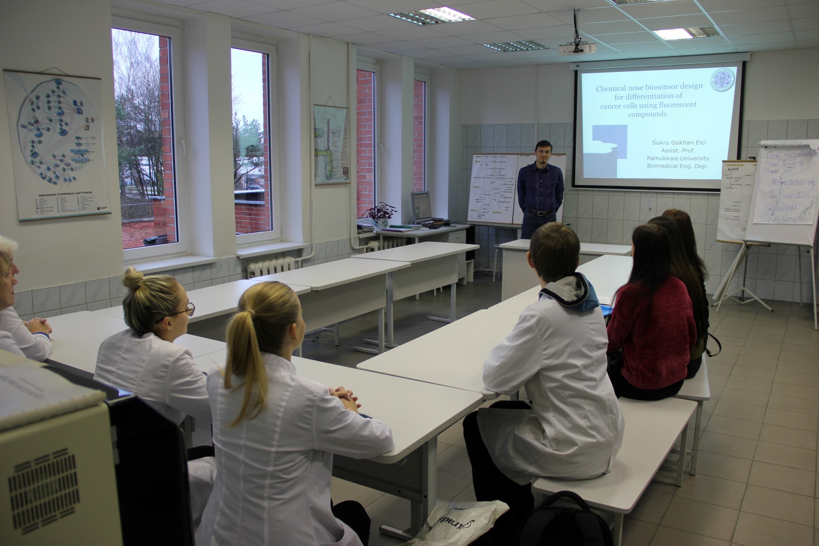 Šiltą dėstytojo priėmimą užtikrino Biomedicininės diagnostikos ir dietetikos katedros docentė dr. Jūratė Graželytė ir lektorė Julija Bogdanovičienė, kurios dr. Sukru Gokhan Elci supažindino su „Biomedicininės diagnostikos“ studijų programa, studentų praktikos ypatumais bei įsidarbinimo galimybėmis, parodė fakulteto auditorijas ir biochemijos laboratorijos įrangą.