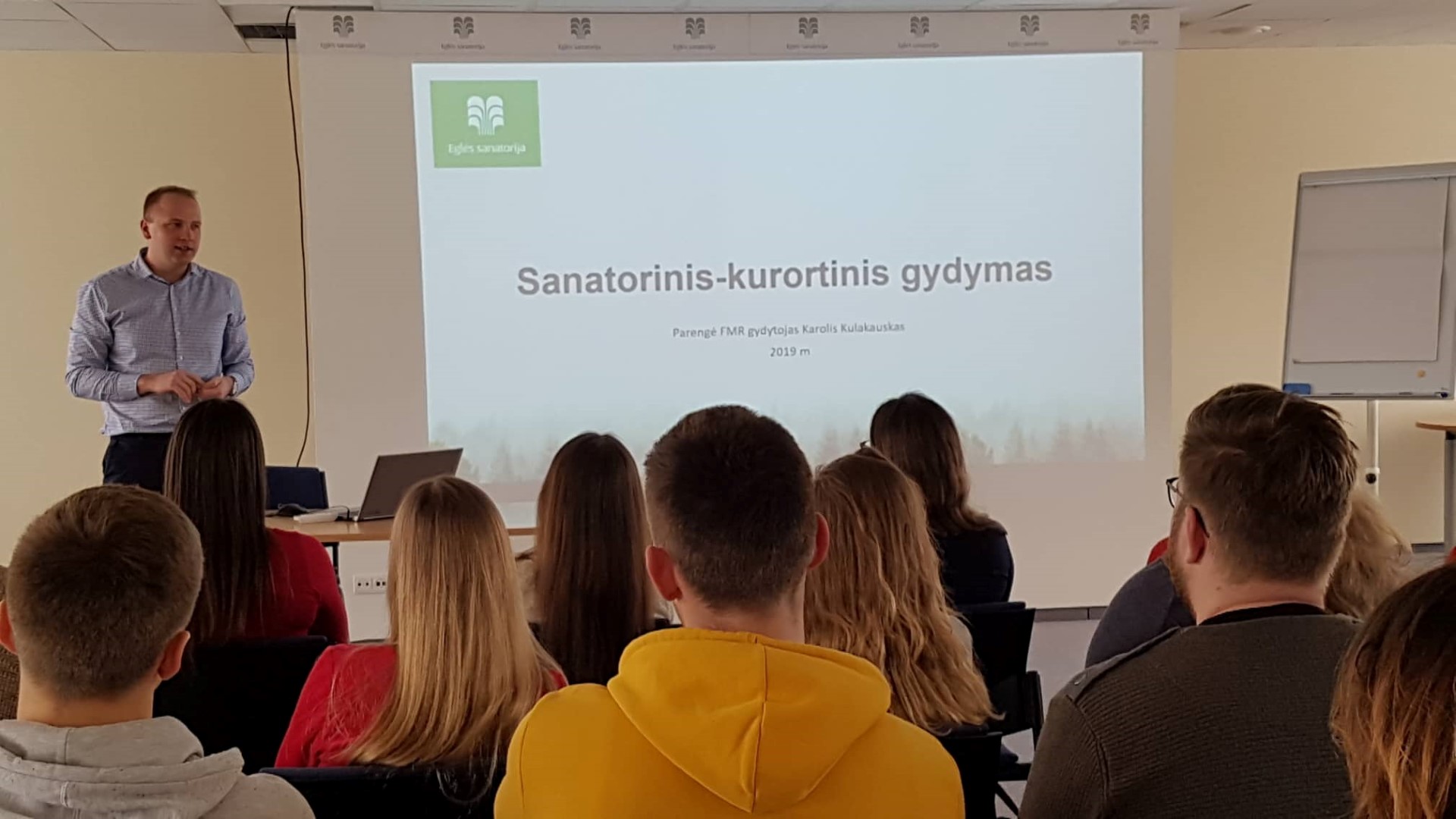 2019-03-28 grupė Sveikatos priežiūros fakulteto „Kineziterapijos“ ir „Ergoterapijos“ studijų programų studentų bei iš Ispanijos pagal Erasmus+ programą atvykusios kineziterapijos studentės „Eglės sanatorijos“ kvietimu lankėsi Druskininkuose. Vizitą Druskininkų „Eglės sanatorijoje“ būtų galima pavadinti „pasimatuok profesiją“ diena. Susitikimo metu žmogiškųjų išteklių specialistės Asta Valaitytė-Brish ir Laura Senkutė pristatė „Eglės sanatoriją“ bei praktikos atlikimo ar savanorystės joje galimybes. Fizinės medicinos ir reabilitacijos gydytojas Karolis Kulakauskas papasakojo apie sanatorinio gydymo ypatumus bei trumpai apžvelgė sanatorijoje atliekamas procedūras. Kineziterapeutė Rūta Maižiešiūtė organizavo klausimų viktoriną bei praktinę užduotį, kurios metu trys drąsiausi studentai turėjo pademonstruoti 10 min. trukmės mankštą lietuviams bei „užsienio svečiams” (savo kursiokams) – lietuvių, rusų bei anglų kalbomis.