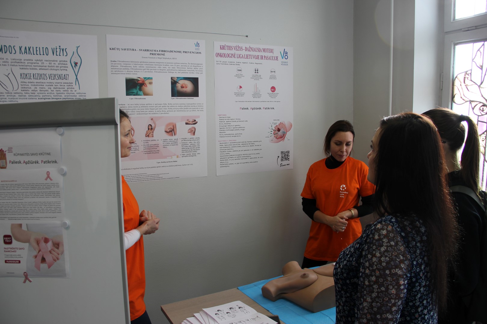2020 m. vasario 7 d. Sveikatos priežiūros fakultete vyko diskusija apie onkologinius susirgimus ir jų prevenciją. Ypatingas dėmesys buvo skirtas krūties vėžiui – dažniausiai moterims nustatomam onkologiniam susirgimui Lietuvoje. Studijų programos „Bendrosios praktikos slauga“ SL19D grupės studentės Laima Versekėnaitė ir Galina Ponkratenko aiškino apie ankstyvą krūtų vėžio diagnostikos svarbą, dalino informacinius lapelius apie krūtų savityrą, ragino atrasti piktybinius darinius ant manekeno.