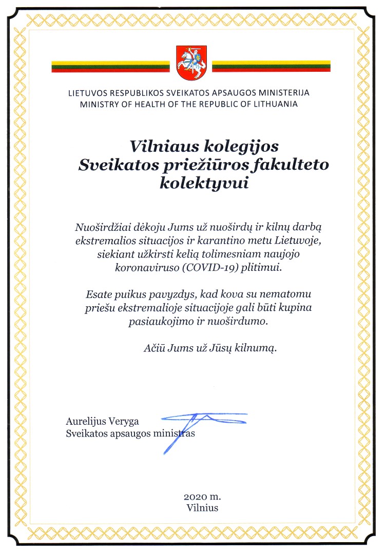 Vilniaus kolegijos Sveikatos priežiūros fakulteto kolektyvas gavo Lietuvos Respublikos sveikatos apsaugos ministerijos padėką už nuoširdų ir kilnų darbą ekstremalios situacijos ir karantino metu Lietuvoje, siekiant užkirsti kelią tolimesniam naujojo koronaviruso (COVID-19) plitimui.